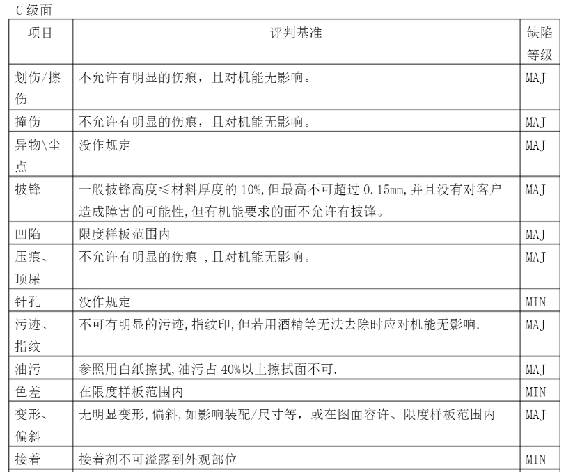 五金沖壓件等級要求一般分為三級,分別按A級、B級、C級下面三張圖分別是五金沖壓件的檢測項目及三級檢測要求。